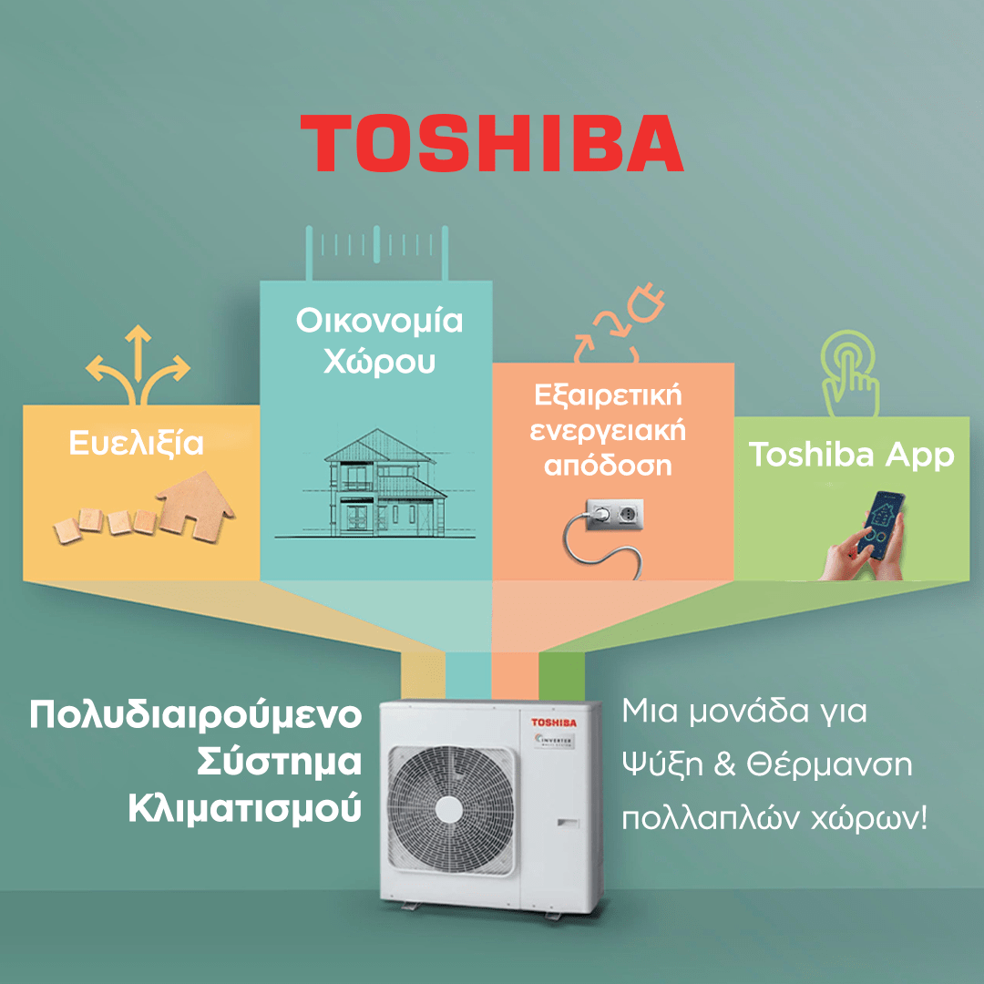 Мултисплит системите на Toshiba са екологично решение, което предлага комфорта и гъвкавостта, които всеки дом и малък офис заслужават. Комбинирайки едно външно тяло с до пет вътрешни тела от същия или различен тип, вие имате перфектната комбинация от естетика и технология.